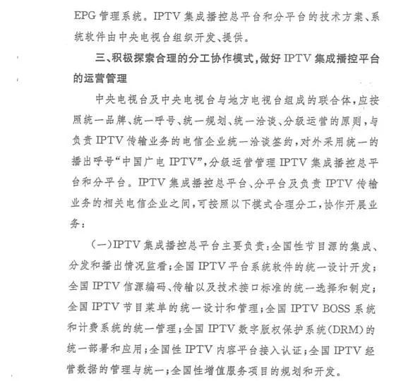 中央电视台和各省电视台要按照国务院三网融合推进部署,在宣传部门指导下,落实全国IPTV集成播控平台的统一建设要求,健全完善节目统一集成和播出控制、电子节目指南(EPG)、用户端、计费、版权等管理子系统,实现IPTV集成播控平台对IPTV节目从播出端到用户端的播控管理。