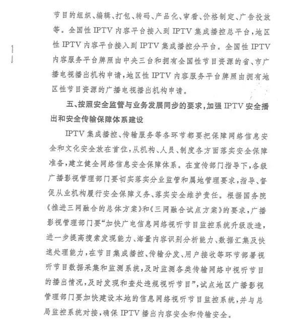 为深入贯彻国务院三网融合工作总体部署,全面落实国务院三网融合总体方案、试点方案和总局关于IPTV建设管理的有关要求,做好三网融合推广阶段文化安全保障工作,现就当前IPTV集成播控平台建设管理涉及的有关问题通知如下: