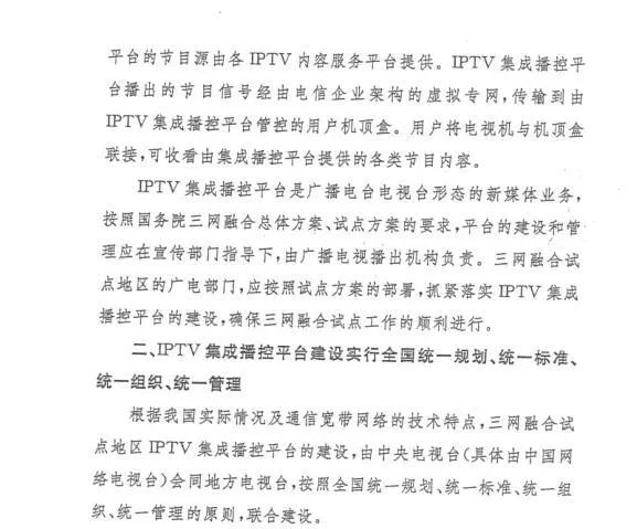 为推动三网融合第二阶段试点工作全面开展,根据国务院三网融合总体方案、试点方案要求,现就各地IPTV集成播控平台建设的有关问题通知如下: