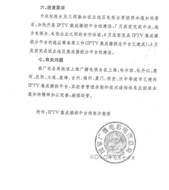 2.进入三网融合推广阶段后的IPTV集成播控平台建设管理工作,仍按照本通知相关要求执行。