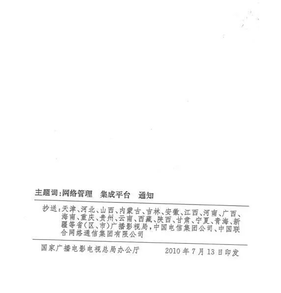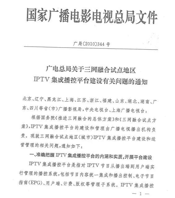 为深入贯彻国务院三网融合工作总体部署,全面落实国务院三网融合总体方案、试点方案和总局关于IPTV建设管理的有关要求,做好三网融合推广阶段文化安全保障工作,现就当前IPTV集成播控平台建设管理涉及的有关问题通知如下: